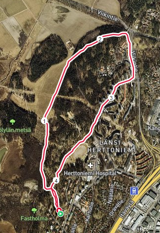 (4.5 km, kahdessa kohdassa kiertoreitti, viisi suorakulmaista mutkaa ja n. 50 m lisämatkaa vakioreittiin)